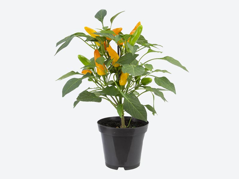 Características: O brilho do fruto colorido em contraste com o verde das folhas tem levado a pimenteira para dentro de casas, escritórios e outros ambientes. Cultivada em pequenos vasos, a planta tornou-se objeto de decoração de interiores muito apreciada. Em todas as regiões do Brasil podem ser encontradas espécies de pimentas. As mais cultivadas no país são pimenta-de-bode, malagueta, de cheiro, cumari, dedo-de-moça e pimenta-do-reino. Para a ornamentação, escolha variedades de menor porte e cor vermelha. Em geral, as sementes são híbridas, como as cultivares gion red, pirâmide e espaguetinho ornamentais e grisu f-1.